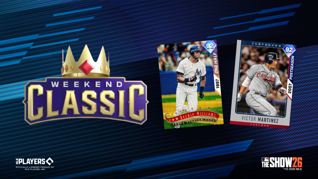 Weekend Classic 1 has returned, a competitive mode that fans love, now available in MLB The Show 26. This mode allows you to compete against other players according to your Ranked Ratings in 1-vs-1 (Solo) matchups. Aim to win as many games as possible during your first six matches, and continue playing to rise on the Weekend Classic leaderboard. Prizes include Packs, Stubs, and player cards featuring new Legend Victor Martinez (92 OVR) and returning Legend Bernie Williams (92 OVR).